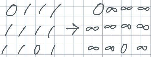 풀이는 모든 1을 무한대로 바꿈으로써, 다른 0에서의 방문 여부를 확인하기 쉽게 한다. 그렇다면 이러한 방법을 사용하지 못하는 경우, 행렬을 하나 더 만들고, 그 행렬을 채워나간 후 return하는 방식을 생각한다. 복사한 행렬의 특정 셀이 비어있는 경우, 해당 셀은 방문하지 않은 셀이다.