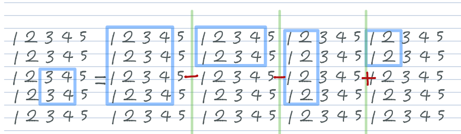 mat[i][j] = dp[r2 + 1][c2 + 1] - dp[r1][c2 + 1] - dp[r2 + 1][c1] + dp[r1][c1]