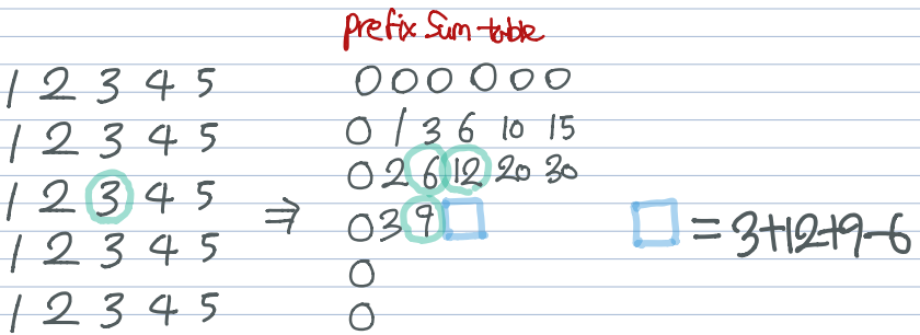 2차원의 경우, 이미지 처리에서 많이 사용되며, 이 경우에도 O(N*M)의 시간복잡도로 구현이 가능하다. preFixSumTable의 경우, 원래 Table의 크키보다 가로, 세로가 1개 더 많게 만들어야 계산이 간단해진다.