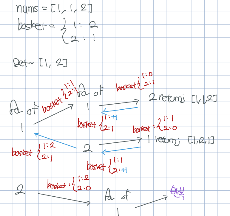 var permuteUnique = function(nums) { let basket = {}; let res = []; let set = new Set(); for(let i = 0; i < nums.length; i++) { set.add(nums[i]); basket[nums[i]] = basket[nums[i]] ? basket[nums[i]] + 1 : 1; } function search(arr) { if(arr.length === nums.length) { res.push(arr); return; } for(let val of set) { if(basket[val] !== 0) { basket[val]--; search([...arr, val]); basket[val]++; } else if(basket[val] === 0) { continue; } } } search([]); return res; };'알고리즘 > 리트코드' 카테고리의 다른 글